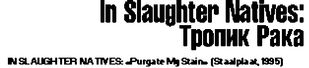 Вся наша жизнь растрачена в этом перманентном промывающем мозги презрении, говорили участники Meat Beat Manifesto . Катедральная готика, нордические мадригалы времен III рейха и тибетские ритуальные оратории, сэмплерная технология и мрачнейшие dark-industrial оркестровки, напоминающие одновременно Рихарда Вагнера и знаменитую Кармина Бурана Карла Орфа, ранний Swans и Laibach времен Opus Dei все легло в основу фундаментального проекта одного человека J.Havukainen, родившегося в Финляндии и развивающего свои безумные звуковые коллажи в Швеции In Slaughter Natives ( В Кровопролитных Вотчинах так можно перевести это название). Его перу принадлежат уже пять альбомов: In Slaughter Natives , Enter Now The World , Sacrosancts Bleed , Mort Aux Vaches (cовместная работа с Deutsch Nepal, записанная живьем для Голландского радио) и новейший Purgate My Stain , три из которых вышли на знаменитом лэйбле экспериментальной индустриальной/амбиент/шумовой музыки из Амстердама Staalplaat ... Ходят слухи, что последнее очищение Хевакейнена может стать и последним альбомом проекта: музыкант хочет завершить этой работой ISN и уйти в иные, скрытые в тайниках его памяти звуки. С полной уверенностью утверждать это пока сложно, однако создается впечатление, что в современном обществе индивидуализма будущее музыки все чаще начинает сосредотачиваться в руках безумно-концептуальных одиночек (вспомните Трента Резнора, Диаманду Галас, Джима Тируэлла или Ника Тернера). Пока все это больше затрагивает экспериментальную электронно-промышленную зону, лишний раз подтверждая тезис ...и один в поле воин , что всецело относится к ищущему забвения в мрачных классико-апокалипсических плясках Св.Витта проекту In Slaughter Natives . Но ведь без танца, без смерти нет настоящего искусства , - как сказал в свое время Курт Воннегут.