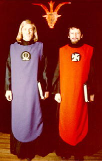 Перед символическим изображением козлиной головы стоял человек в геральдическом плаще, вроде тех, какие используют в церемониях священники католической и англиканской церкви. В центре плаща был виден символ, напоминавший букву омега. Как мы узнали впоследствии, человек этот назывался Сакрифист. У входа стоял другой человек, одетый, под плащом, в черную рясу до пят. По центру она была украшена символом Процесса из четырех букв "P", составленных в подобие свастики. Этот участник церемонии был известен как Евангелист. Сакрифист держал книгу в красном кожаном переплете, Евангелист - такую же книгу, но черного цвета.
